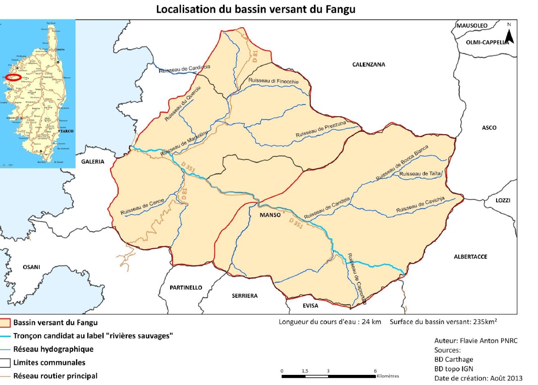 Le bassin versant du Fangu est situé dans le département de la Haute Corse sur la façade occidentale de l’île. Sa superficie est de 235 km². Il regroupe trois communes : Galéria qui occupe toute la basse vallée du Fangu, Manso dans la partie amont, et la commune de Calenzana qui occupe le haut Marsulinu au nord.